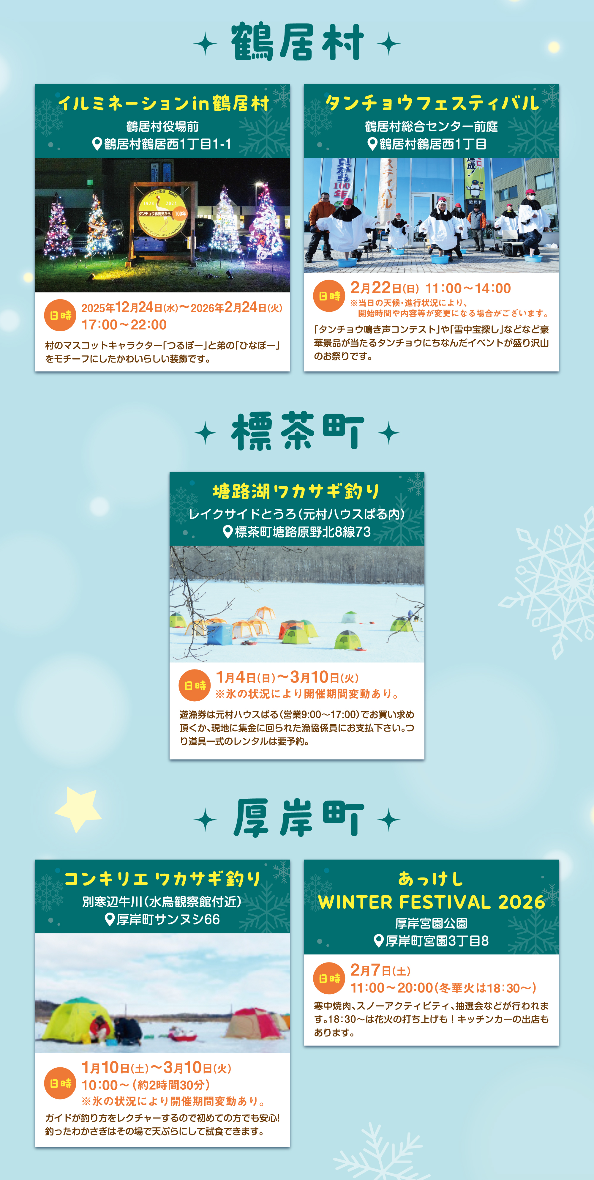 タンチョウ結婚式、冬の子ども縁日、タンチョウ解説ガイドなど、楽しい催しが盛りだくさん。